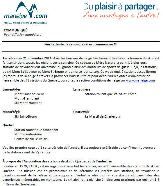 Stoneham, 18 novembre 2014 – Grande nouvelle pour la Station touristique Stoneham qui devance son ouverture de la fin-novembre à ce vendredi, 21 novembre 2014. Fidèle à sa tradition et à sa réputation de fête, la station ouvrira pour une soirée de glisse soit dès 16h, pour ensuite être ouverte les samedis et dimanches de 8h30 à 21h30. Grâce à cette ouverture précipitée, elle devient ainsi la première station de la grande région de Québec à ouvrir ses portes.