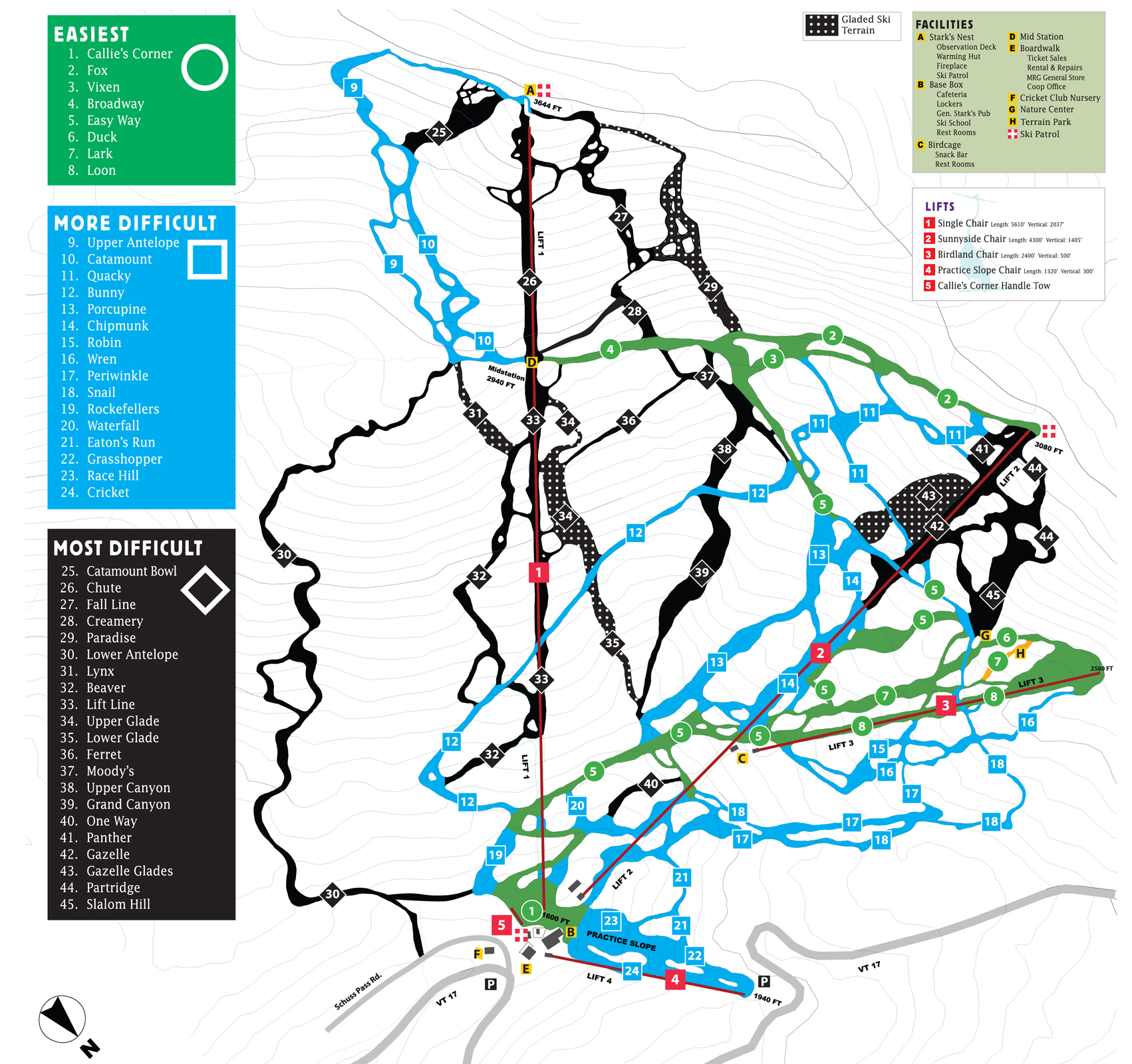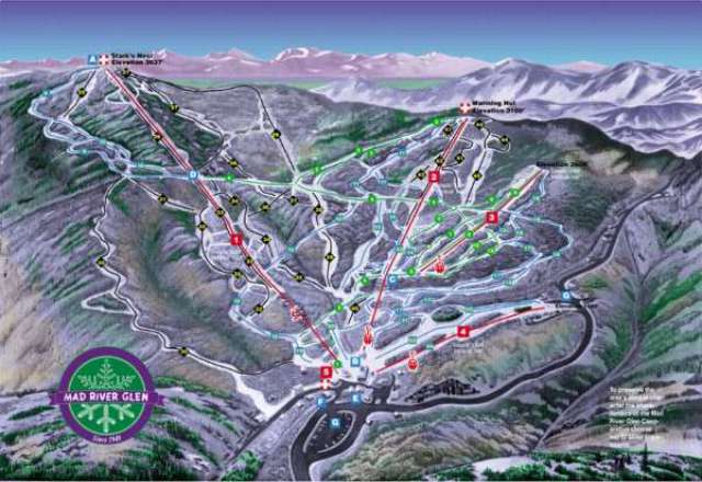 Beginners can ski Mad River Glen. In fact, with uncrowded slopes, a great ski school and your own lift and area, there is no better place to learn. From the base area ride the Sunnyside Chair and follow the "Easiest" signs to Fox and then Snail to the "Birdland" novice area. Once in Birdland, simply follow the snowflakes (on the map) marking the easiest way down. Here you will discover the charm and diversity of Mad River skiing.